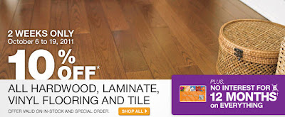 Looking to update the flooring in your home? Right now, The Home Depot is offering 10% off on all regular priced hardwood, laminate, vinyl flooring and tile, until October 19, 2011. This discount does not apply to the labour component of installation services.
