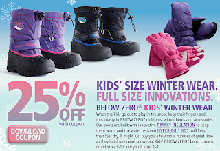 From now until October 24, 2011, Mark’s (formally named Mark’s Work Wearhouse) is offering a coupon that can be redeemed at time of purchase, to get 25% off any regular priced Below Zero kid’s winter boots and accessories. Kid’s Below Zero boots come in infant sizes 9-13 and youth sizes 1-4. There is a limit of one coupon per customer.