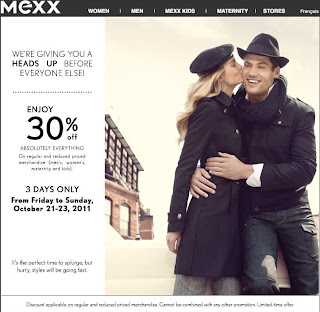 Mexx is having a customer appreciation even this weekend (Friday to Sunday, October 21-23, 2011). During the sale, you can save 30% off absolutely everything in-store! This includes regular and reduced priced merchandise (men’s, women’s, maternity and kids). You don’t need a coupon or anything to take advantage of this sale.