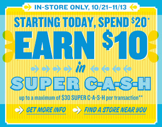 From now until November 13, 2011, for every $20 you spend at Old Navy, you get $10 in Super Cash to spend on your next in-store purchase, up to a maximum of $30 per transaction. The Super Cash can be redeemed from November 17 to November 22, 2011. You can redeem $10 in Super Cash for every $20 you spend. Additional conditions apply.