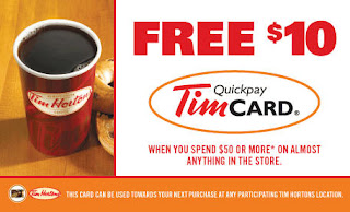 Shop at Shoppers Drug Mart this Saturday and Sunday (October 15-16, 2011) and receive a $10 Tim Hortons card. This promotion excludes prescriptions, products that contain codeine, tobacco products (where applicable), stamps, passport photos, lottery tickets, event tickets, transit tickets and passes, electronic gift cards, Life Experiences packages and pre paid phone cards. There is a limit of one Tim Card per transaction per customer.