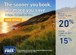 WestJet has a 2-day only sale where the sooner you book, the more you’ll save. You’ll save 20% off when you book by Wednesday, October 19, 2011 (11:59pm MT) or 15% off when you book by Thursday, October 20, 2011.