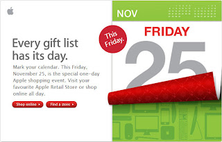 Shopping event prices are solely available on November 25, 2011, from 12:01 a.m. to 11:59 p.m. PST, are subject to change and do not include taxes and environmental fees, if applicable. Promotional pricing cannot be combined with any other offers. Not all sale products are available in all Apple Retail Stores. Product specifications are subject to change. Sale prices are limited to stock on hand and while supplies last.Unfortunately, Apple is not telling us what kind of sales they'll be having so we'll all have to wait and visit their retail store or website on Friday. Until then, you can browse the Apple Online Store for great ideas.