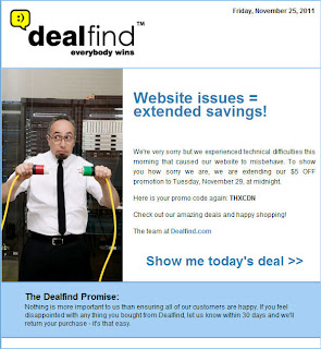 DealFind’s website was experiencing some technical difficulties for a short period of time yesterday. To make it up to us, they issued a $5 Off promotion code! The promo code is THXCDN. Just enter the code at checkout when you make any purchase on DealFind.com. The promotion code is valid until Tuesday, November 29, 2011 at midnight!