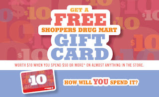 Get a $10 gift card when you shop at Shoppers Drug Mart and spend $50 or more. This promotion is valid from today to November 18, 2011. This offer excludes prescription purchases, products with codeine, tobacco products (where applicable), stamps, passport photos, lottery tickets, event tickets, transit tickets and passes, gift cards, prepaid phone cards, prepaid card products and Shoppers Home Health Care locations. The gift card expires on December 9, 2011.