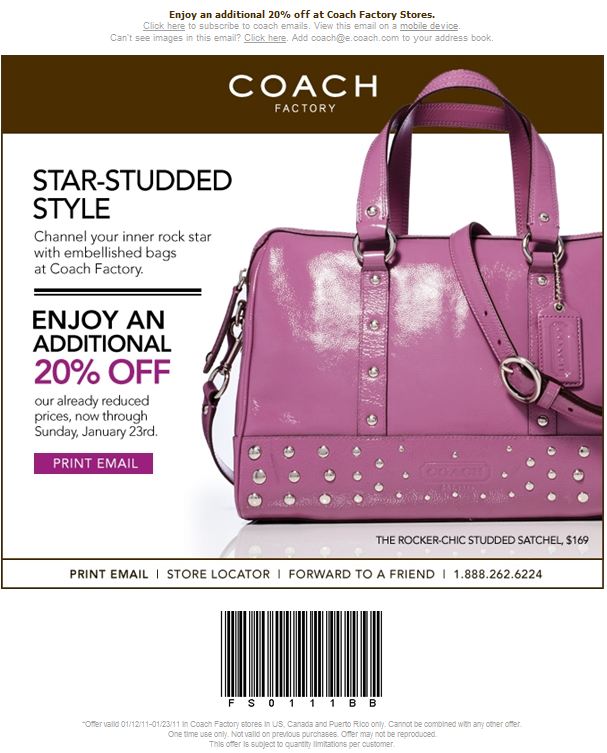 Coach Factory Store currently has a new printable coupon where you can enjoy an additional 20% off their already reduced prices. The Coupon is valid from now until Sunday, January 23, 2011 and can be used at all Coach Factory Stores in Canada and US.