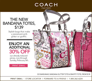 Coach Factory store just released another printable coupon. Enjoy an additional 30% off their already reduced prices now until Sunday, February 6, 2011!
