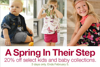 Gap just sent me an email about this sale. For 3 days only, starting today until February 5, 2011, enjoy 20% off select kids and baby collections. This sale is valid in-stores and online. If you're shopping online, Gap offers free shipping on all orders of $50 or more.
