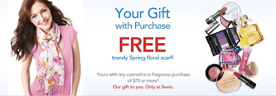 Interested in a free floral scarf? From now until March 28, 2011, Sears is giving away a free trendy floral scarf with any cosmetics or fragrance purchase of $75 or more. Some conditions apply.