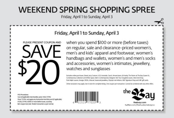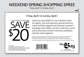 You can save $20 when you spend $100 or more (before taxes) at The Bay this weekend (Friday, April 1 to Sunday, April 3, 2011). The sale applies on pretty much everything at The Bay including regular, sale and clearance-priced women's, men's and kids' apparel and footwear, women's handbags and wallets, women's and men's socks and accessories, women's intimates, jewelery, watches and sunglasses.