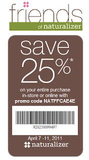 During the Friends of Naturalizer Event, from now until April 11, 2011, get 25% off your entire purchase online and in-store. Print and present your Friends of Naturalizer coupon in-store or shop online using the promo code NATFFCAE4E at checkout.