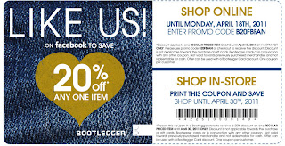 Bootlegger is offering a 20% off one regular priced item when you present this printable coupon in-store. This in-store offer is valid from now until April 30, 2011. The same promotion is offered online from now until April 18, 2011. Enter the promo code B20FBFAN at the checkout to receive your discount. Remember, both offers can be used with your Bootlegger Card discount. Some additional conditions apply.
