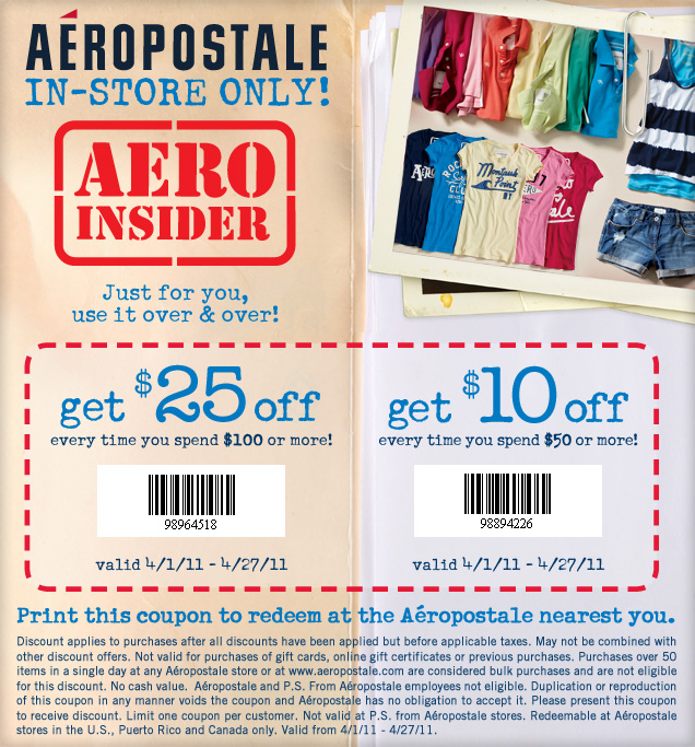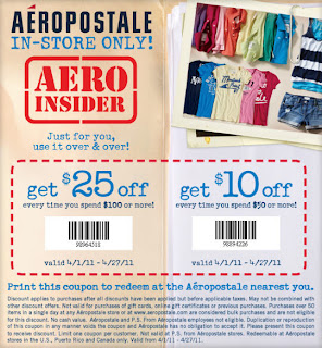 Aeropostale has a printable coupon that can be used in-store to get $10 off on your purchase of $50 or more, or $25 off if you spend $100 or more. This offer is valid until April 27, 2011. Limit of one coupon per customer. Some additional restrictions apply.