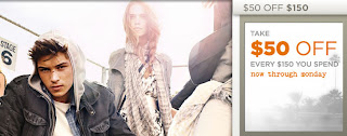 Get $50 off every $150 that you spend at Armani Exchange from now until April 25, 2011. This offer applies online and in-stores. For online purchases, the discount will be automatically applied to orders of $150 or more, excluding tax and shipping, at checkout.