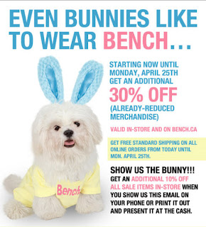 Bench is giving an additional 30% off already-reduced merchandise, until April 25, 2011. This offer is available both online and in-store. The discount will be automatically applied at checkout for online orders.