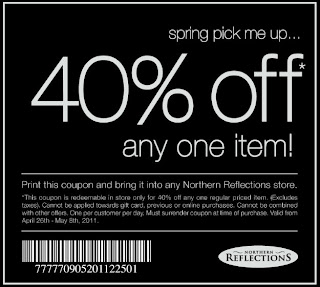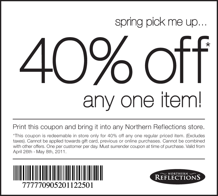 Print this coupon and present it at time of purchase at any Northern Reflections store to receive 40% off one regular priced item. One coupon per customer, per day. This promotion can not be combined with any other offers and is valid until May 8, 2011.