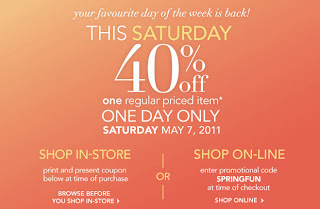 Today only (Saturday, May 7, 2011), shop at your nearest Cleo store or online and receive 40% off on one regular priced item. This is a 1-day only sale.