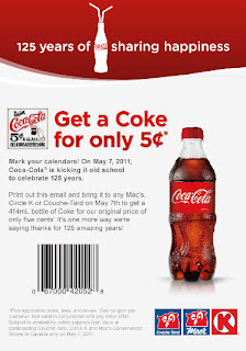 To celebrate the 125th anniversary of Coca Cola, they are teaming up with Mac's and offering a 414mL bottle of Coke for only 5 cents (just like in the old days)! This special offer will only be valid on Saturday, May 7, 2011.