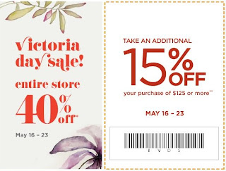 From May 16 -23, 2011, Banana Republic Factory Store is having a Victoria Day Sale where you can save 40% off the entire store! Plus, you can save an additional 15% if you spend $125 or more.