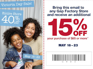 Gap Factory Store: 40% Off Entire Store Victoria Day Sale. Plus an extra 15% Off $85 Purchase or more (May 16-23)