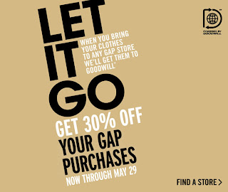 Save 30% off your purchases, from now until May 29, 2011, when you bring in your old clothes to any Gap store. The clothes will be donated to Goodwill.
