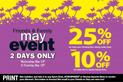 Sportchek has another Friends & Family sales event from Wednesday, May 18 to Thursday, May 19, 2011. This is a 2-day only sale. During the sale, you can save 25% off regular priced items and 10% off sale items.