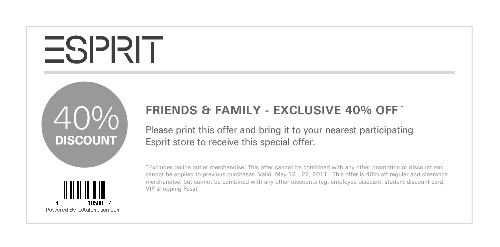 Between May 19 and May 22, 2011, Esprit is having a Friends and Family Event. Visit your nearest store and receive 40% off, regular price and sale items, when you present this coupon at time of purchase. For online shopping, simply enter the promotion code FAMILY11 to get the discount at checkout.