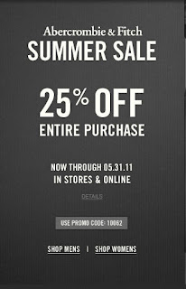 Abercrombie & Fitch is having a 25% off your entire purchase summer sale until May 31, 2011. This promotion applies in-store and online. To shop online use the promo code 10062 at checkout to receive the discount. To shop in-store, the coupon must be presented at time of purchase. One coupon per transaction and offer cannot be combined with other promotions. Some additional restrictions apply.