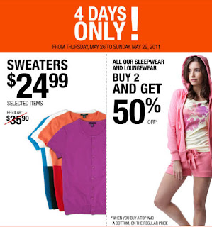 Visit your nearest Jacob store from now until May 29, 2011, and receive 50% off when you buy a regular priced sleepwear or loungewear top and bottom. Plus, selected sweater styles are now $24.99.