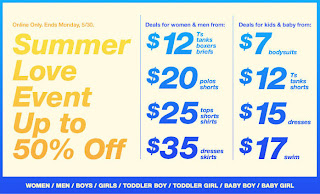 During the Summer Love event, from now until May 30, 2011, Gap is offering up to 50% off when you shop online. Deals start at $12 for men`s and women`s merchandise and $7 for kids and baby items. Remember that shipping is free with orders of $50 or more. Just select the Free Every Day option in the shopping bag.