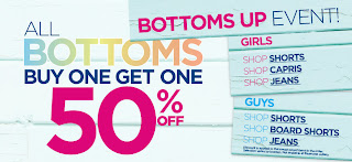 Bluenotes is having a Bottoms Up Event! For a limited time, buy one bottom and receive the second for 50% off. This includes men's and women's shorts, capris and jeans. The discount is applied to the lowest priced item. This promotion does not apply at Bluenotes outlet stores.