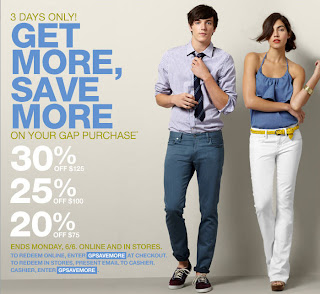 Starting today and ending on Monday June 6, 2011, Gap is having a get more, save more on your purchase sale. Save 30% off on purchases over $125, 25% off for purchases over $100 and 20% off on purchases of $75 or more. This offer is valid online and in-store. To redeem online use the promo code GPSAVEMORE at checkout. Some conditions apply.