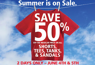 For two days only, June 4 to June 5, 2011, Mark's Work Wearhouse is having a huge 50% off sale on regular priced shorts, tees, tanks and sandals. In addition, there are printable coupons valid for June, July and August. These coupons include a $10 off on $50 purchase, 20% off entire purchase and 40% off on a single regular price item.