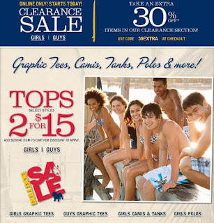 Aeropostale is having an online Clearance Sale until Sunday, June 26, 2011. You can save an extra 30% off on all clearance items by using the promo code 30EXTRA at checkout. Some additional conditions apply.