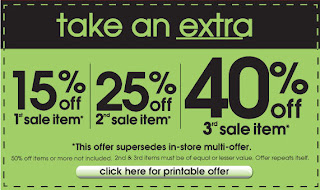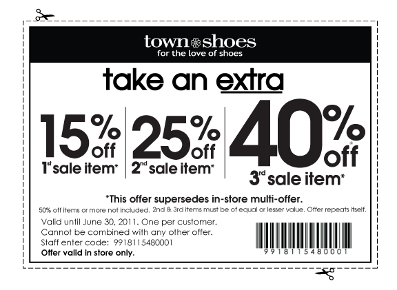 Town Shoes is offering a spend more, get more printable coupon that is valid until June 30, 2011. You can save 15% off the 1st sale item, 25% off the 2nd sale item and 40% off the 3rd sale item. This offer excludes items on sale for 50% or more. There is a limit of one coupon per customer and the coupon cannot be combined with any other offer. This offer is in-store only and must be surrendered at time of purchase. Some additional conditions apply.