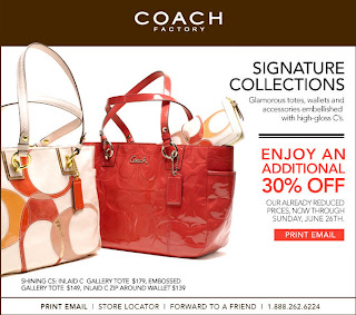Coach Factory Store has another great coupon. This coupon will save you an additional 30% off their already reduced prices. The coupon is valid from now until Sunday, June 26, 2011.