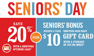 Seniors shopping at Shoppers Drug Mart today will receive 20% off their purchase with a Shoppers Optimum card. Plus, receive a Senior's bonus $10 gift card with a purchase of $50 or more. The gift card is valid until August 18, 2011. The offer excludes prescription purchases, tobacco products, cosmetics and fragrances, stamps, transit tickets and passes, products with codeine, gift cards, passport photos, lottery tickets, event tickets and prepaid phone cards and Shoppers Home Health Care locations.