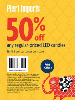 Pier 1 Imports is offering a different "Daily Dealy" every day on their Facebook page until July 31, 2011. Simply "Like" them on Facebook to get their daily coupon. With today's deal, that runs until July 29, 2011, you can save 50% off any regular-priced LED candles. Simply present the coupon at time of purchase. There is a limit of two per customer. This coupon cannot be combined with any other coupon or discount.