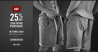 From now until August 7, 2011, you can save 25% off your entire purchase when you shop at Abercrombie & Fitch! This sale is available in-store only at all participating stores in Canada. To take advantage of this sale, simply provide the promo code "10071".