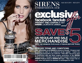 Sirens' Facebook page has a $5 off coupon towards your next $25 minimum purchase (before taxes). The coupon is valid from August 1-31, 2011 and is valid on regular and sale merchandise at all Sirens stores in Canada. You must print the coupon and give it to the cashier to take advantage of this deal. There's a limit of one coupon per transaction, per customer.
