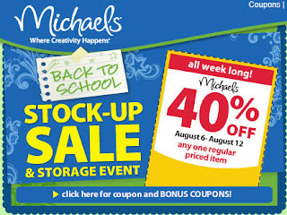 Michaels' just sent me an email of their latest coupons. One of the coupons will save you 40% off any one regular price item and is valid until Friday, August 12, 2011. There's another coupon that will save you 60% off any custom frame order.