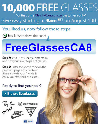 Clearly Contacts is giving away another 10,000 pair of FREE glasses TODAY (Wednesday, August 10, 2011) starting at 11am MST! Simply be one of first 10,000 people in Canada to go to Clearly Contacts website and enter the promo code "FreeGlassesCA8". This promotion is valid for first time ClearlyContact.ca glasses customers only.