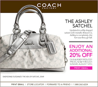 Coach Factory Store has a new printable coupon that will save you an extra 20% off their already reduced prices! The coupon is valid until Sunday, August 14, 2011.