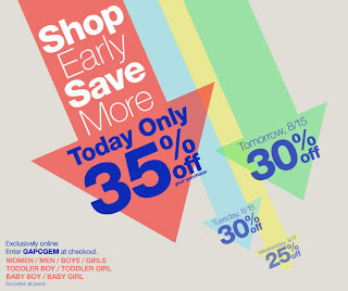 During Gaps Shop Early and Save More event, the earlier you shop, the more you save. Save 35% off on your entire purchase today. Save 30% off tomorrow and Tuesday, and save 25% off on Wednesday. This offer is exclusively online only. Simply use the promo code GAPCGEM at checkout to receive the appropriate discount each day.