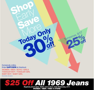 During Gaps Shop Early and Save More event, the earlier you shop, the more you save. Save 30% off on your entire online purchase today or save 25% off tomorrow (Wednesday). This offer is exclusively online only. Simply use the promo code GAPCGEM at checkout to receive the appropriate discount each day.