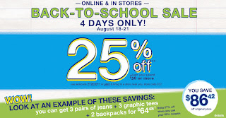 The Children's Place is having a Back To School Sale from now until August 21, 2011. You can save 25% off on your purchase of $50 or more when you present the printable coupon at time of purchase. If you want to shop online, simply use the webcode 2T2E2011 at checkout to receive the discount. Some conditions apply.