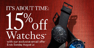 Accessorize and save with the printable coupon from The Bay! Until Sunday (August 21, 2011), you can save 15% off on watches online and in-store. This promotion excludes Michele, Burberry, Tissot, Coach, Michael Kors, Timex, Casio and various other brands. This offer is valid on regular priced items only. When shopping online, use the promo code WATCH15 at checkout to receive the discount.