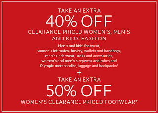For a limited time, you can save an extra 40% off clearance priced women's, men's and kids merchandise at The Bay. Plus, you can also save an additional 50% off on women's clearance priced footwear. The discounts excludes women's fashions such as The Room, Theory, Not Your Daughter's Jeans, Miss Sixty, Diesel, Free People, Trina Turk, Eileen Fisher, Elie Tahari and Hugo Boss Black. Men's fashions exclude Diesel, Armani Jeans, suits, sportcoats, blazers, dress shirts and ties.