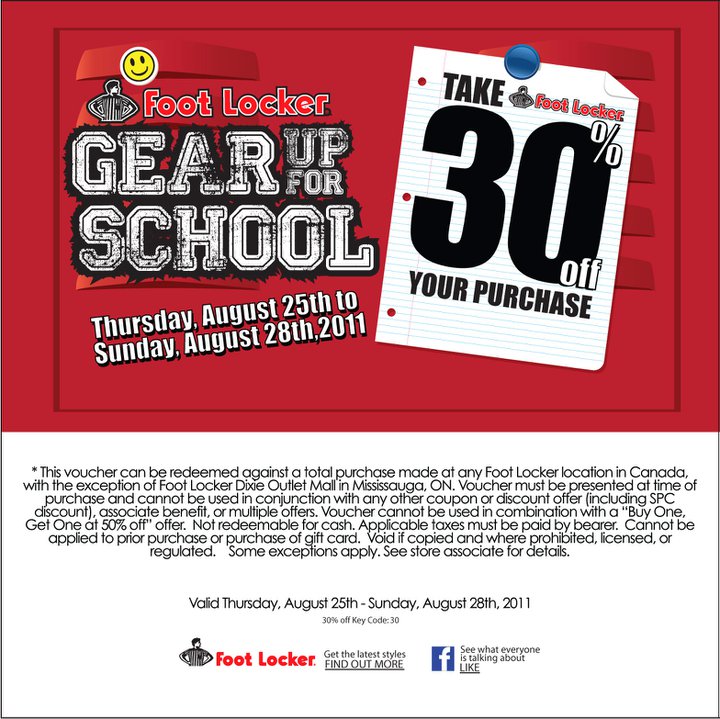 Foot Locker has a 'Gear Up For School" sale this Thursday, August 25th to Sunday, August 28, 2011. During the sale, you can take 30% off your total purchase when you print the coupon in this post and present it to the cashier.