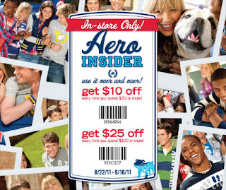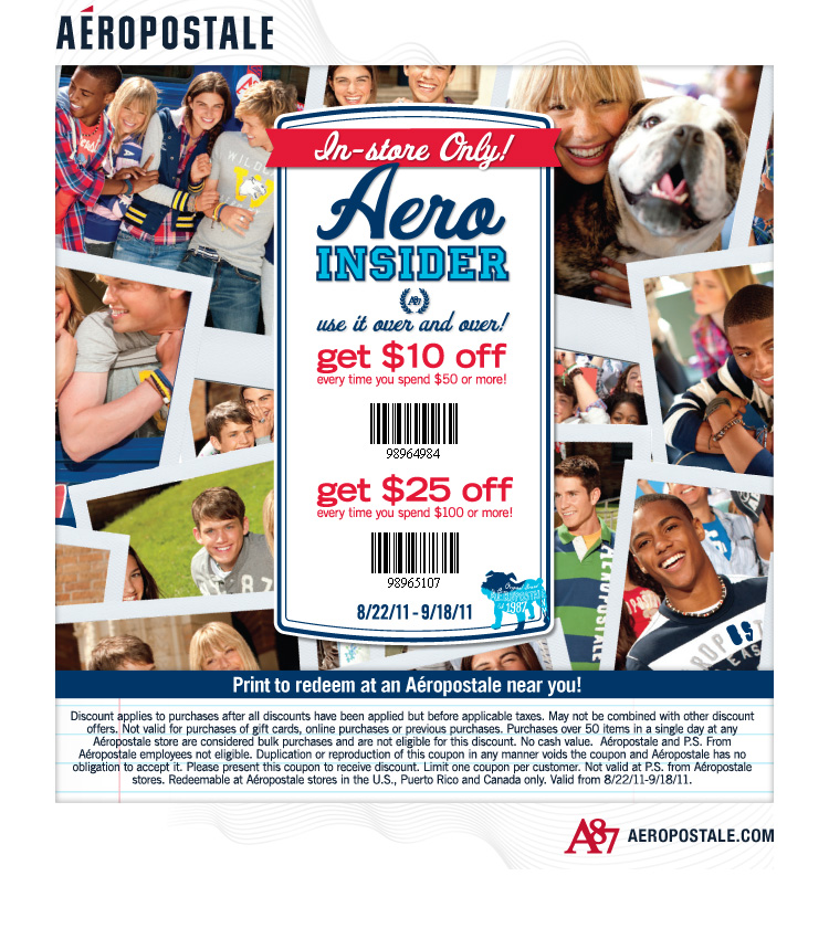 Until September 18, 2011, you can save $10 when you spend $50 or more at Aeropostale. Spend $100 or more and you will get $25 off your purchase with the printable coupon. There is a limit of one coupon per customer and this coupon cannot be combined with any other discount offer.